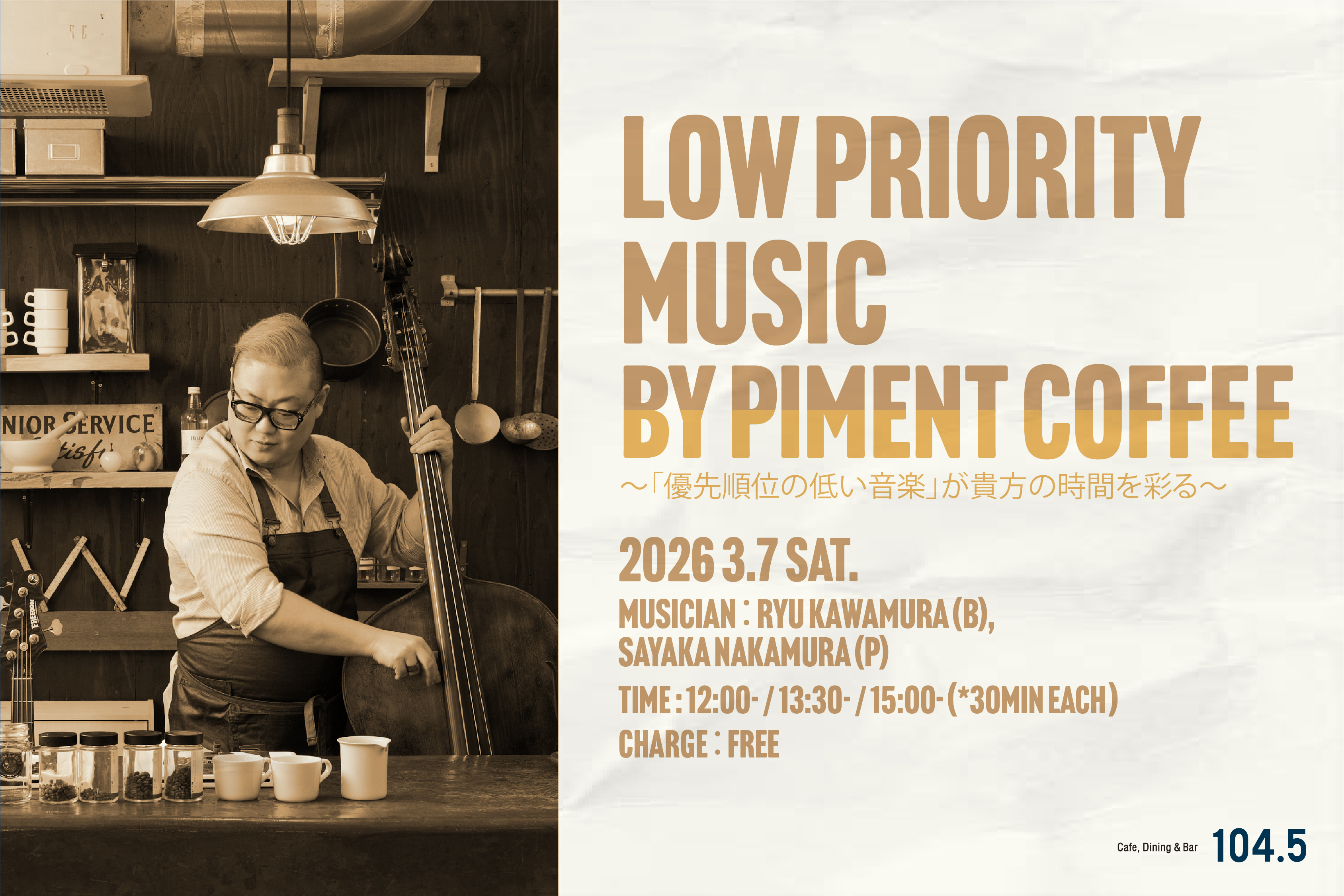 ブルーノート・ジャパンがプロデュースする “Cafe, Dining & Bar 104.5(イチマルヨンゴー)” では、食、お酒、音楽に興味があり、新しい店舗を一緒に育ててくれるスタッフを募集しています。